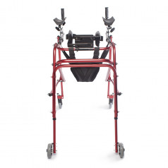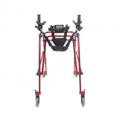 Ходунки легко адаптируются под ребёнка: можно отрегулировать высоту и настроить элементы поддержки под индивидуальные особенности. Дополнительные фиксаторы корпуса и таза помогают удерживать стабильное положение, а подлокотники дают уверенную опору при движении. Модель подходит для использования как в процессе реабилитации, так и в повседневной активности.
