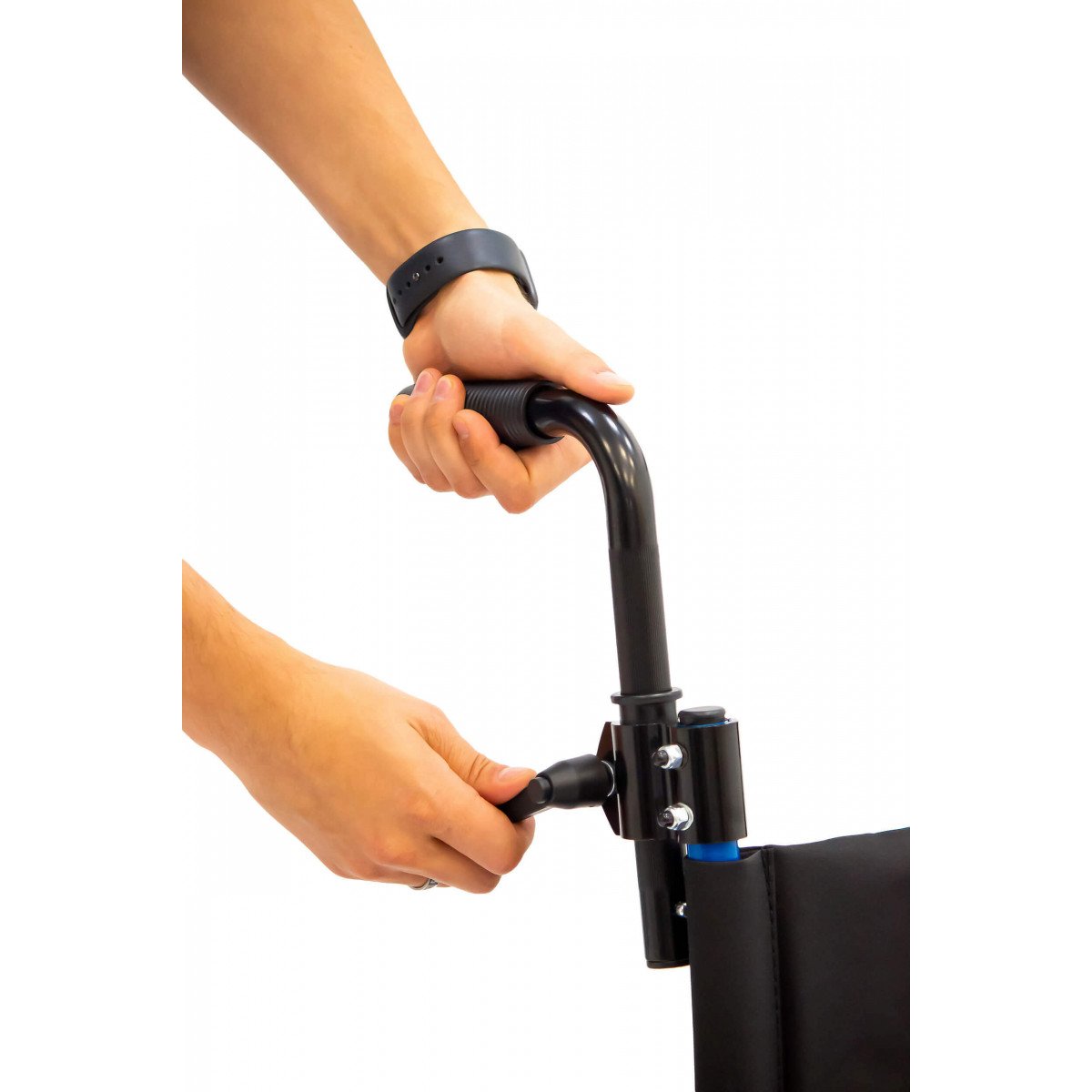 Сиденье и спинка выполнены из прочного нейлона, который устойчив к износу и прост в уходе. Литые колёса не требуют обслуживания и обеспечивают надёжность в ежедневном использовании. Для безопасной остановки предусмотрены боковые стояночные тормоза.
