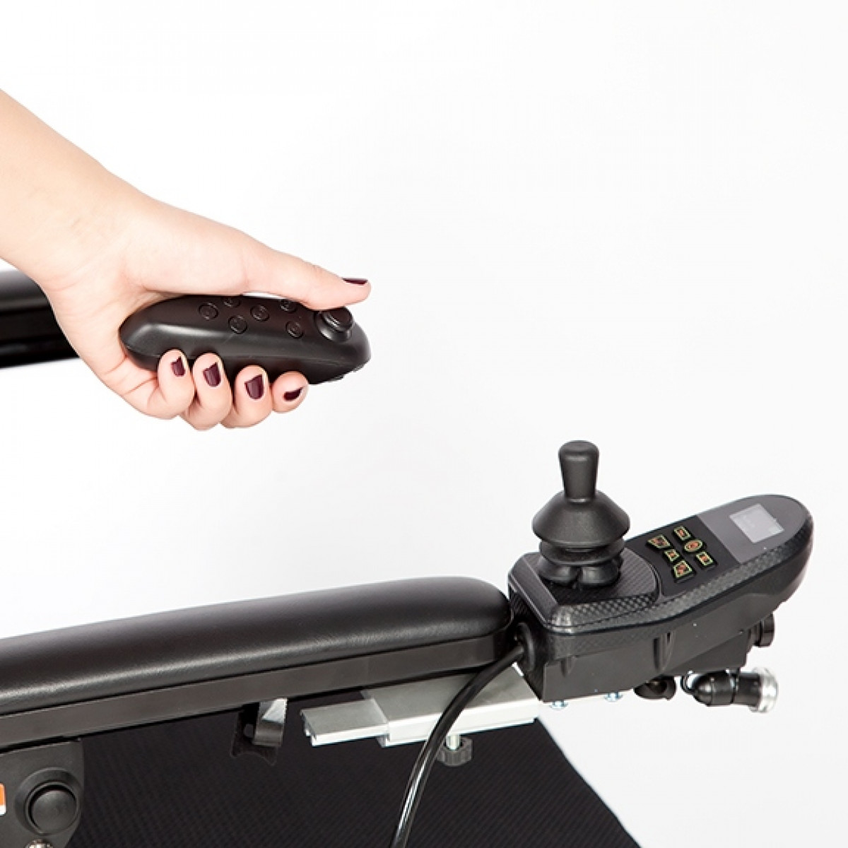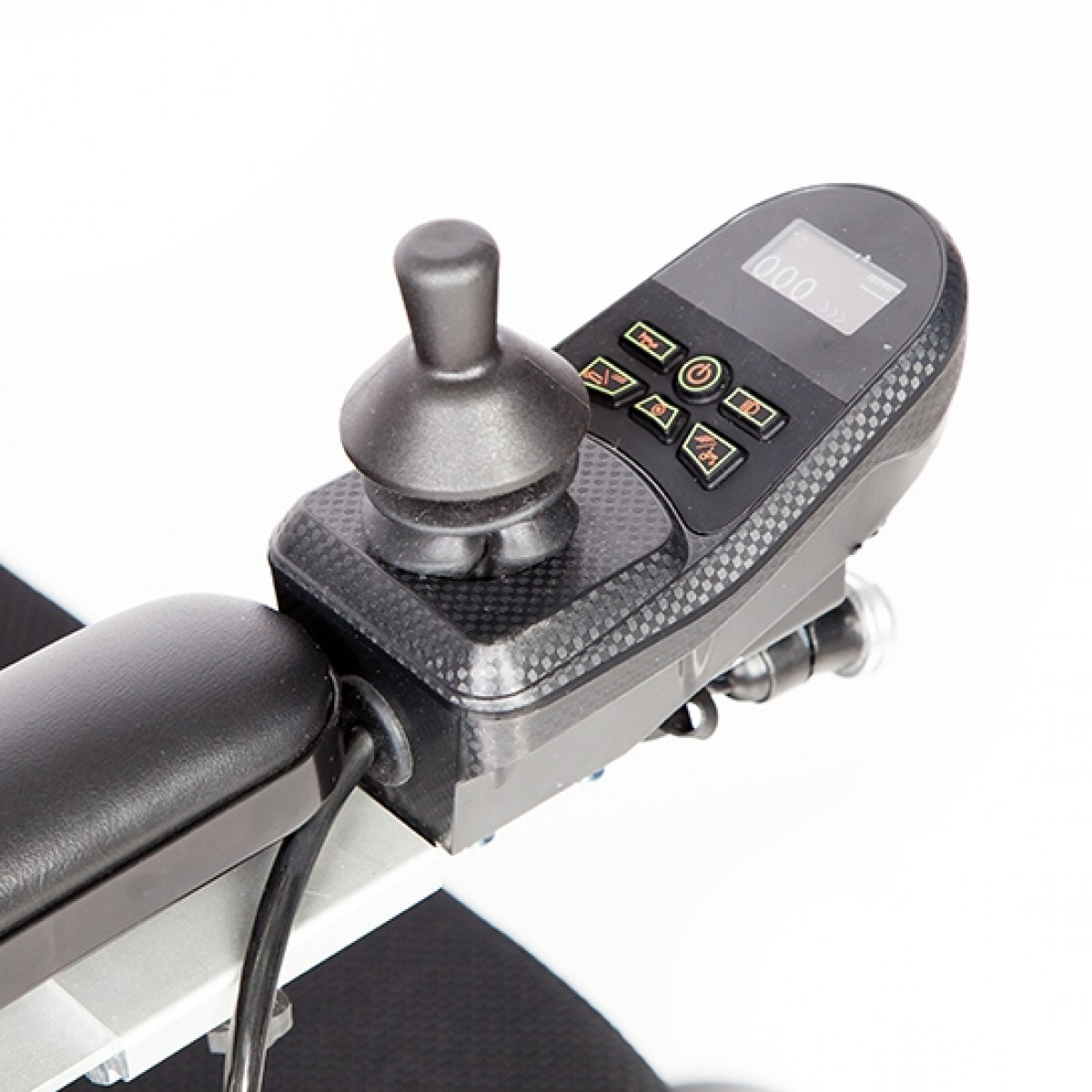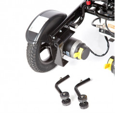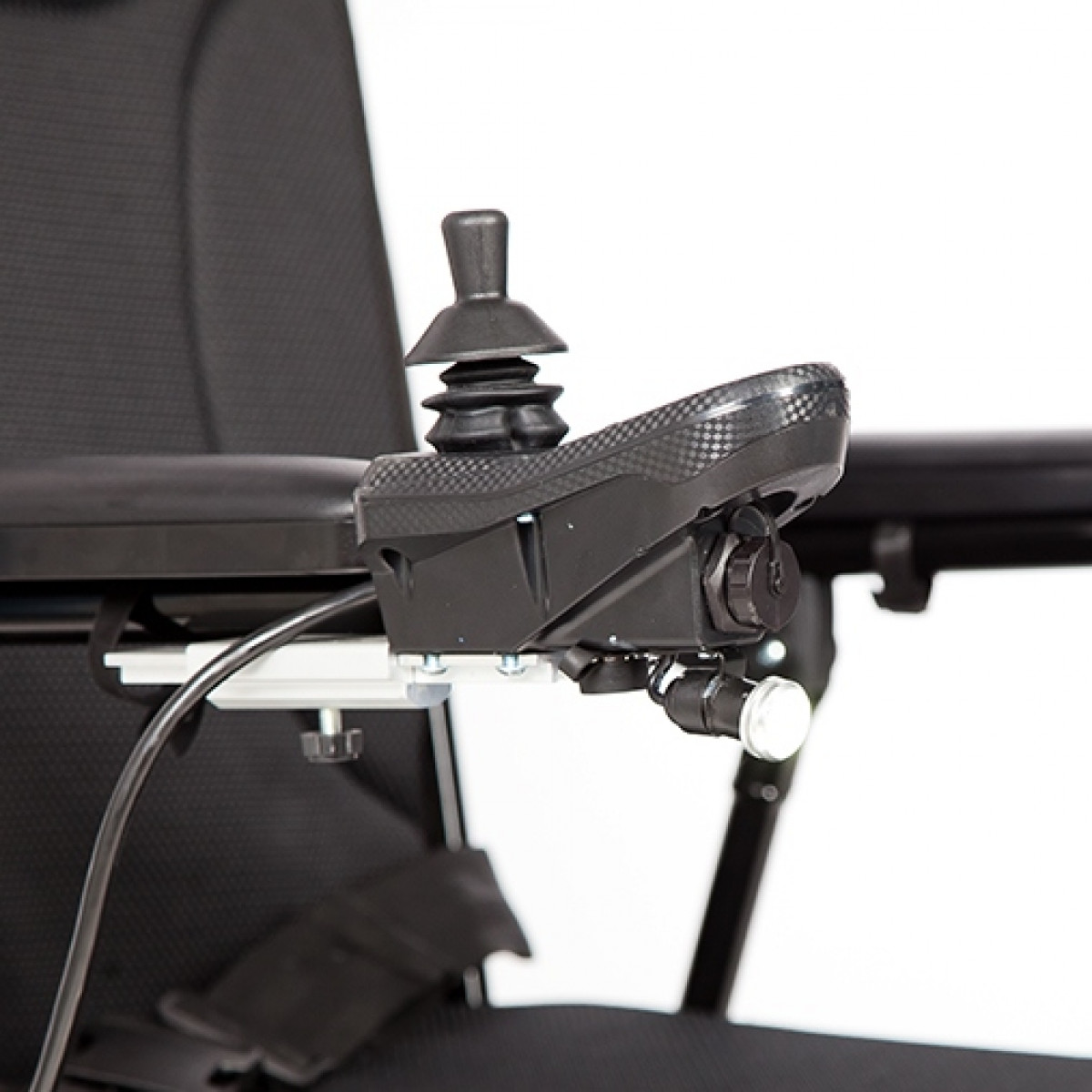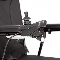 Рама изготовлена из прочного алюминия с антикоррозийным покрытием, что делает конструкцию надёжной и долговечной. Спинка складывается для удобной транспортировки. Электропривод можно отключить, чтобы использовать коляску в режиме сопровождения. Управление осуществляется манипулятором, который можно установить под любую руку и настроить по вылету, а для дополнительного удобства предусмотрен пульт дистанционного управления. В комплект входит зарядное устройство и всё необходимое для эксплуатации.