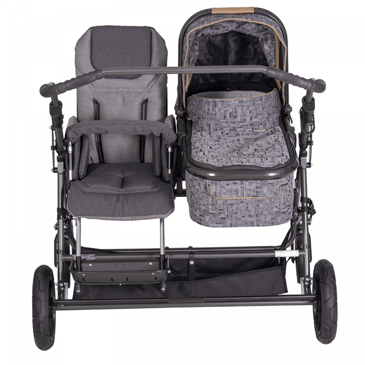 Коляска построена на полностью складывающемся шасси Tom 4 с пружинной подвеской, задними пневматическими колёсами и поворотными передними колёсами — она устойчива, плавно едет и легко управляется. Сиденье и люлька съёмные, могут устанавливаться по ходу или против хода движения, а при необходимости использоваться отдельно на собственных шасси, что делает систему максимально гибкой.
