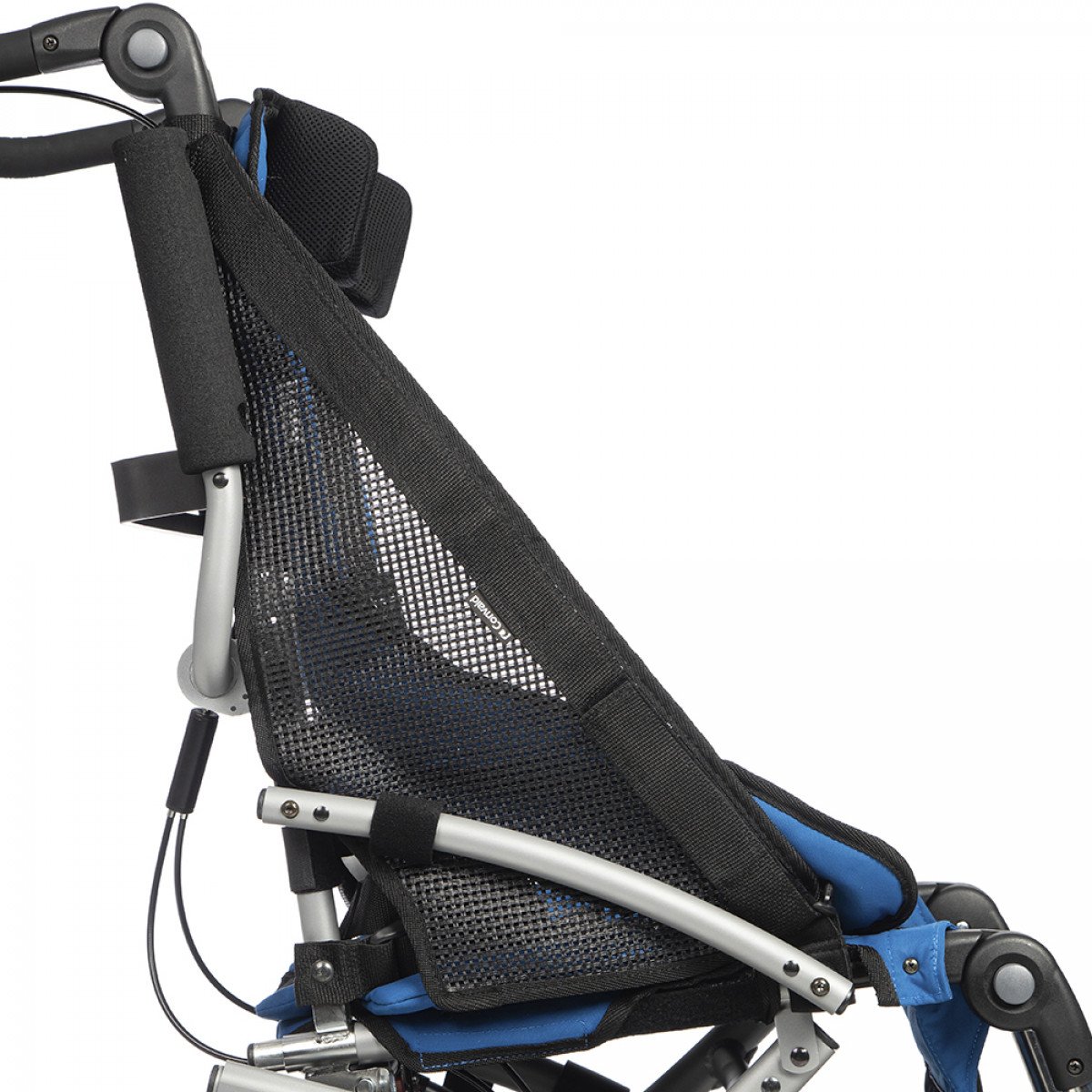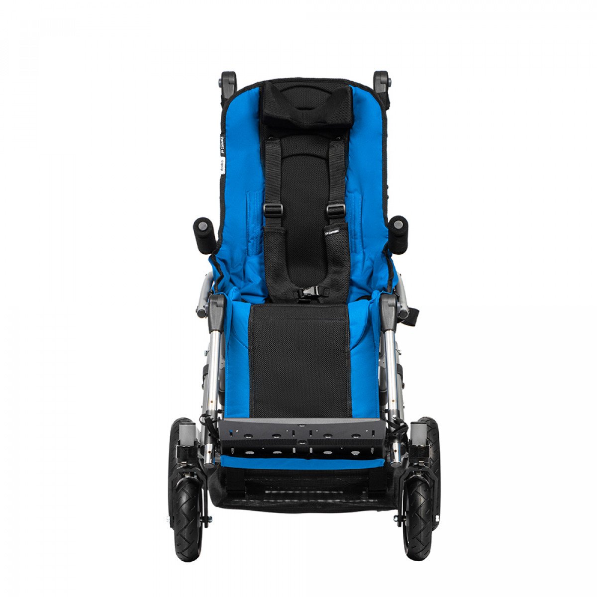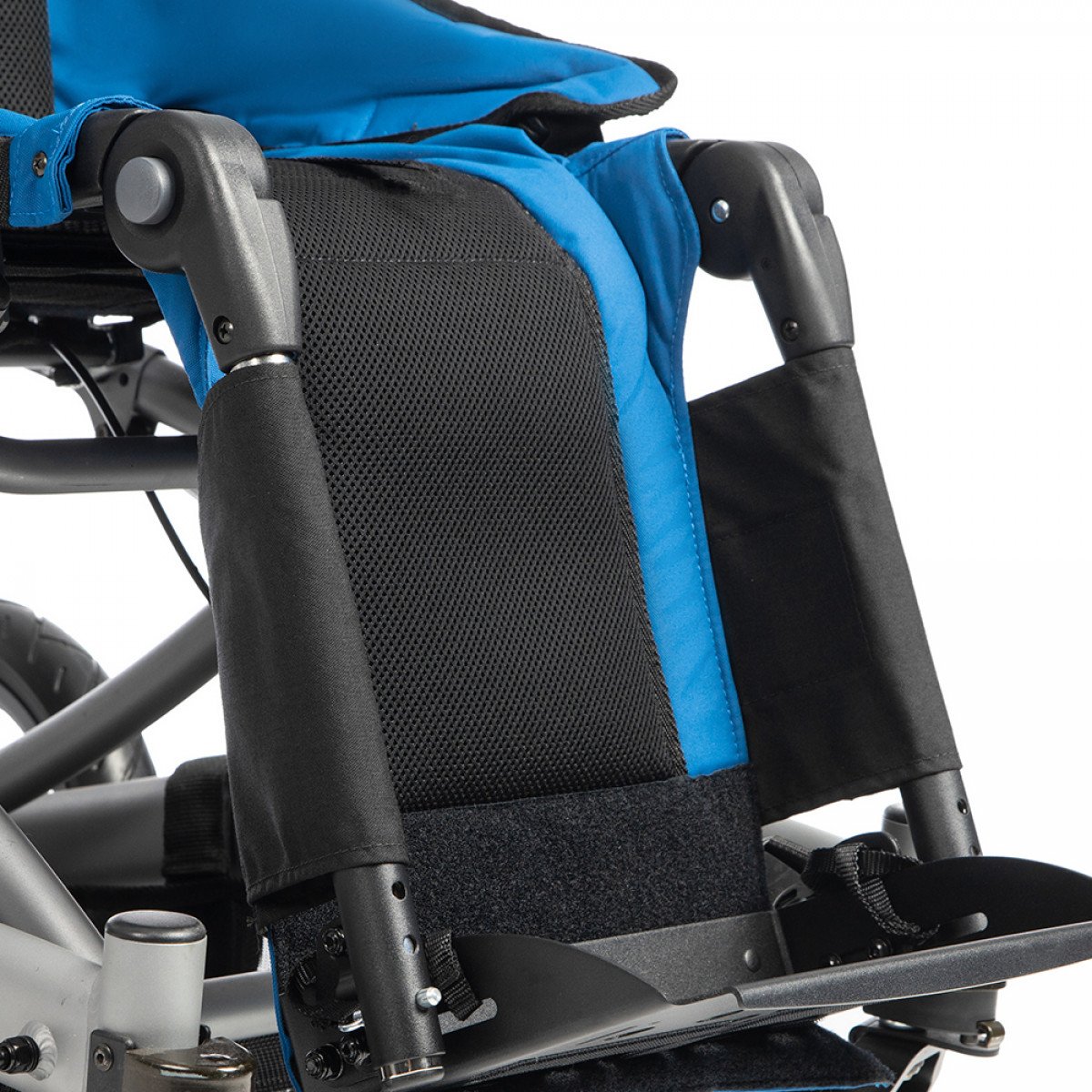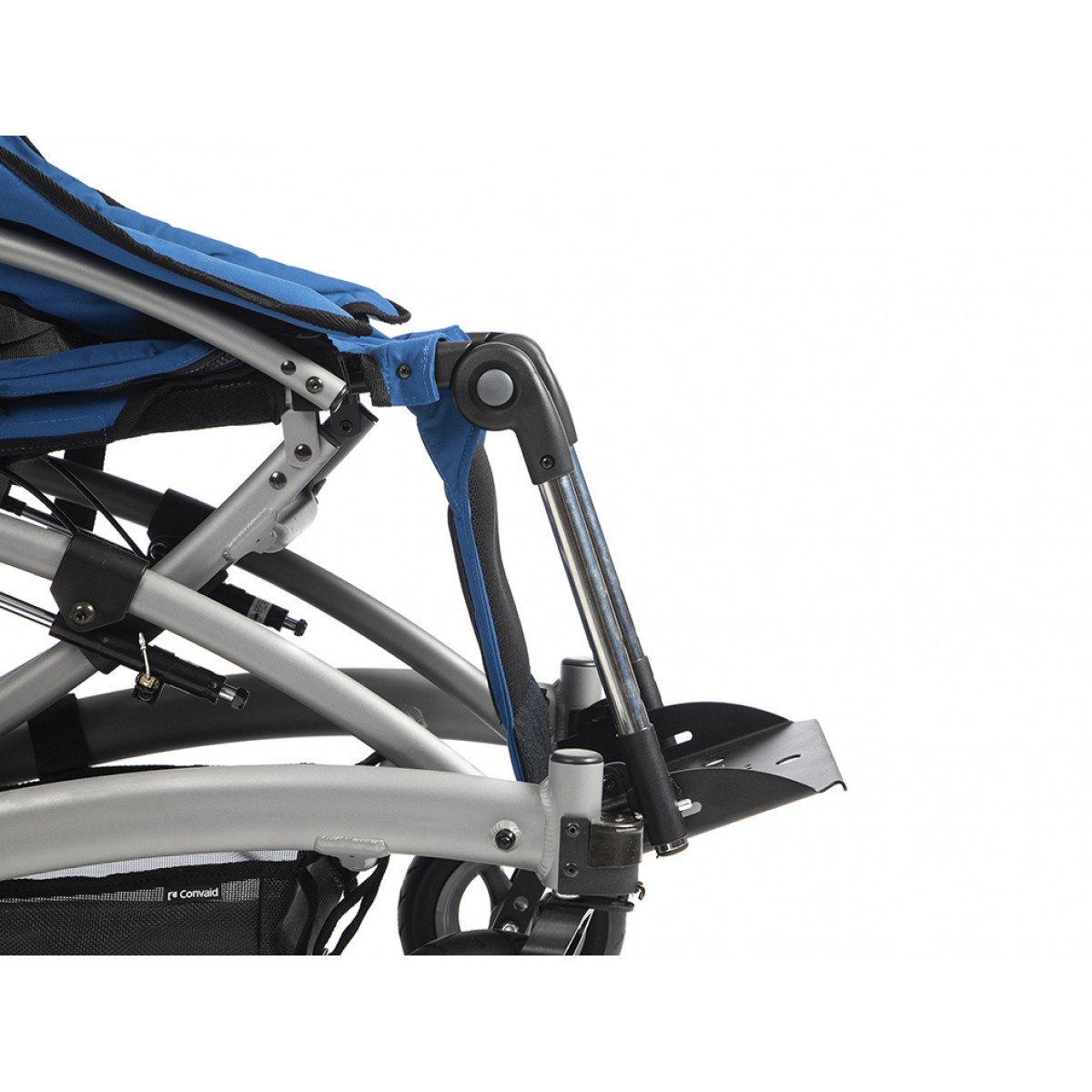 Коляска настраивается под потребности ребёнка: угол наклона спинки и сиденья плавно регулируется, позволяя менять положение от сидячего до более расслабленного. Удлинённое сиденье даёт дополнительную опору для ног, а подножки и опоры для стоп регулируются по длине, углу и глубине — это помогает точнее зафиксировать положение и снизить лишнее напряжение.
