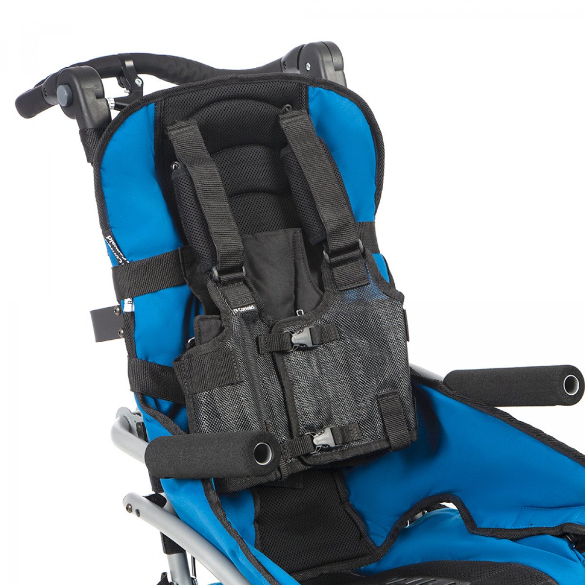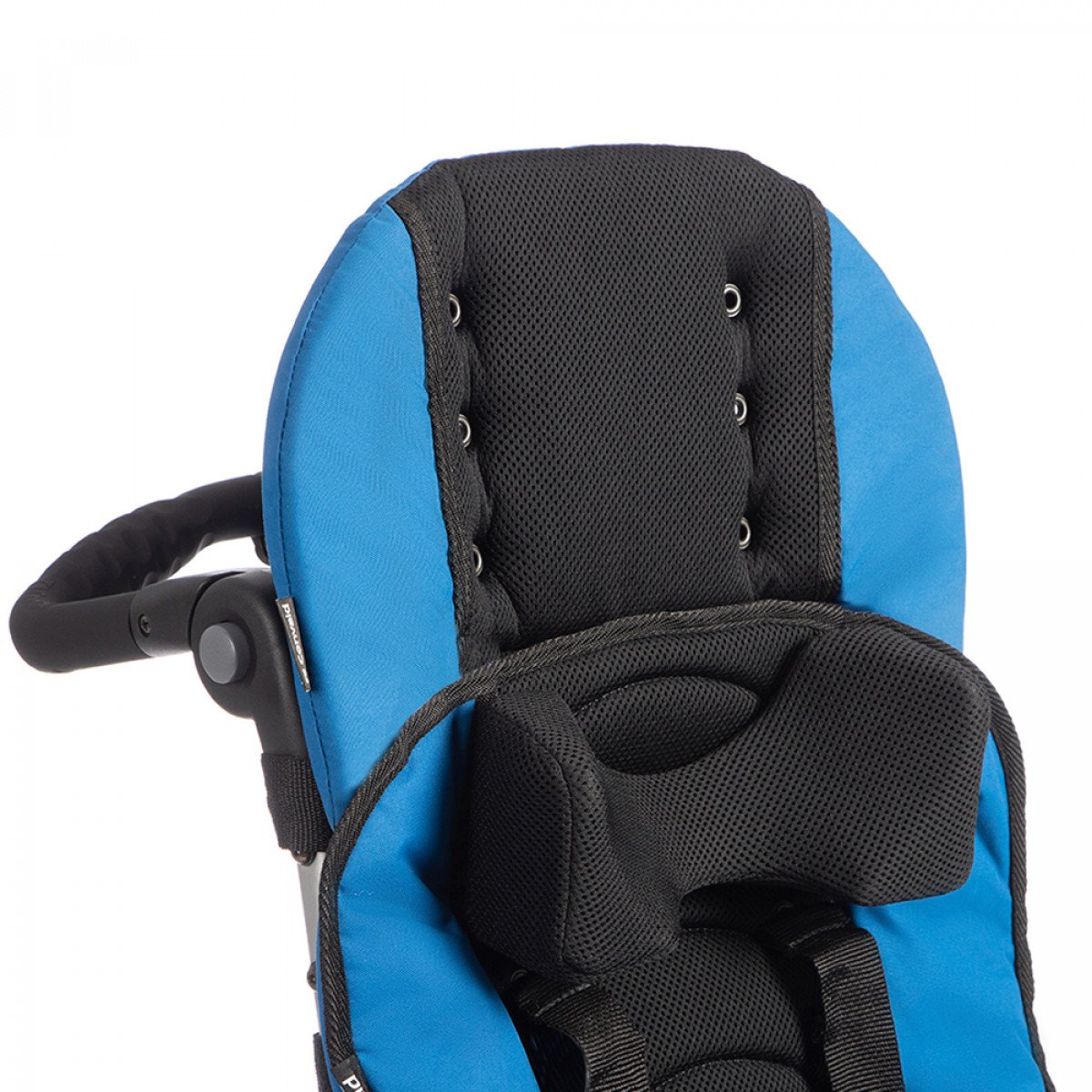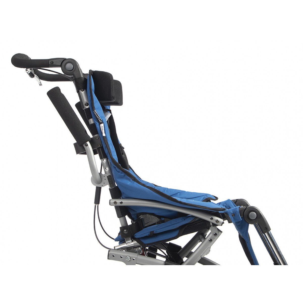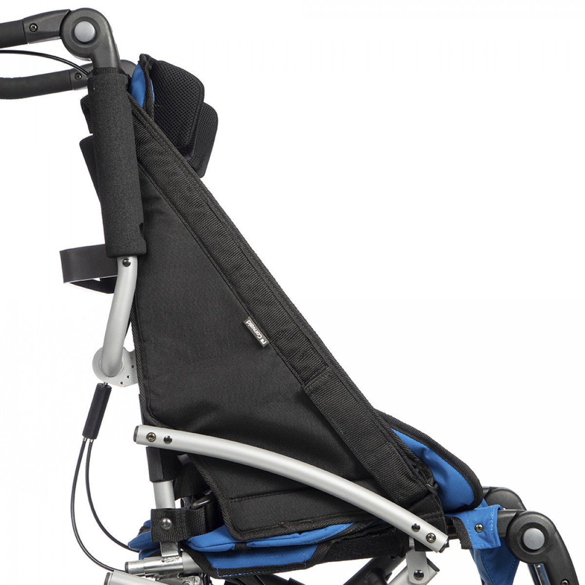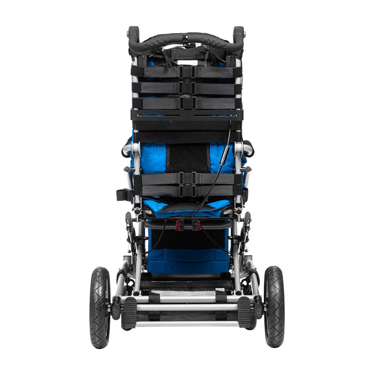 Коляска настраивается под потребности ребёнка: угол наклона спинки и сиденья плавно регулируется, позволяя менять положение от сидячего до более расслабленного. Удлинённое сиденье даёт дополнительную опору для ног, а подножки и опоры для стоп регулируются по длине, углу и глубине — это помогает точнее зафиксировать положение и снизить лишнее напряжение.