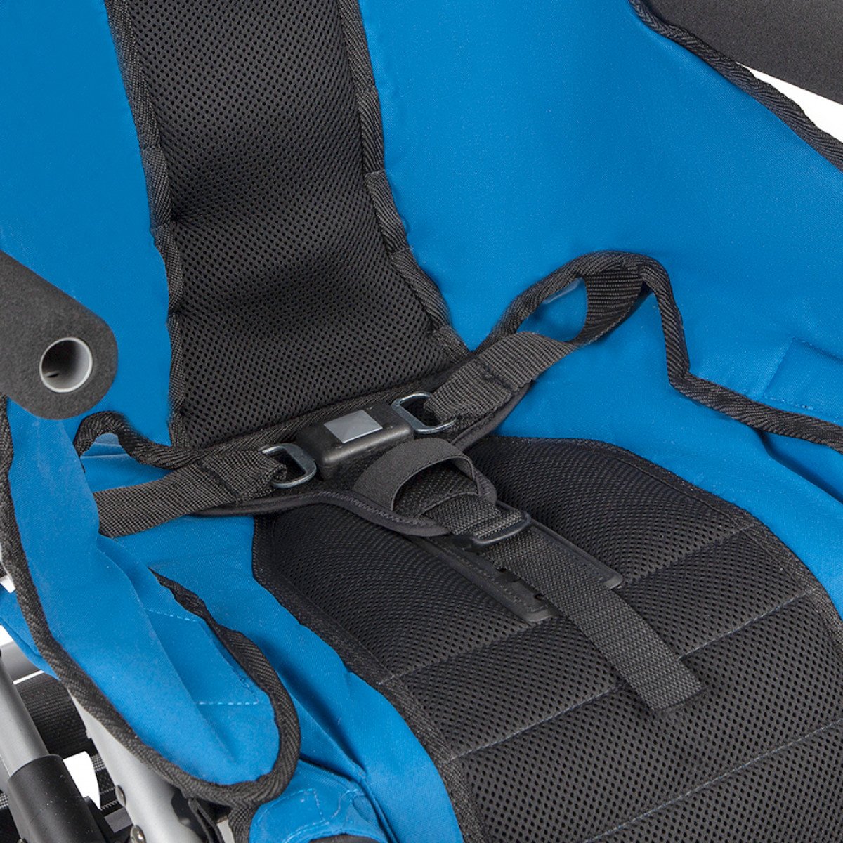Для безопасности предусмотрен пятиточечный ремень, а контурный подголовник поддерживает голову, не ограничивая обзор. Подлокотники мягкие и откидные, что упрощает пересаживание. Съёмный капюшон защищает от солнца и осадков, а прозрачное окошко позволяет контролировать состояние ребёнка. Обивка выполнена из дышащего материала, легко снимается и очищается, а встроенная корзина подходит для хранения необходимых вещей.