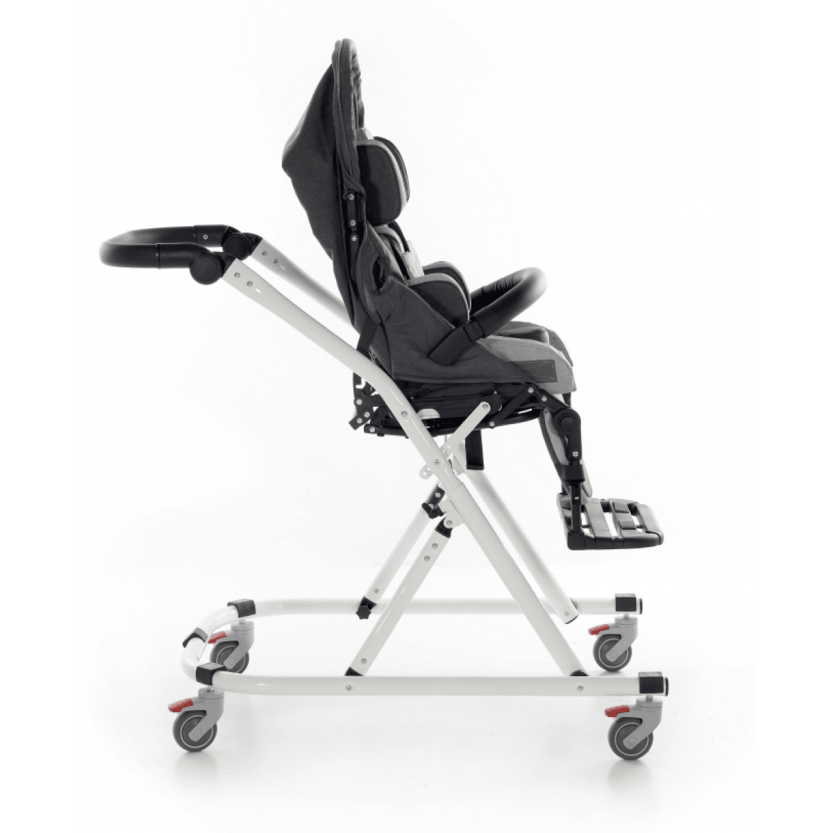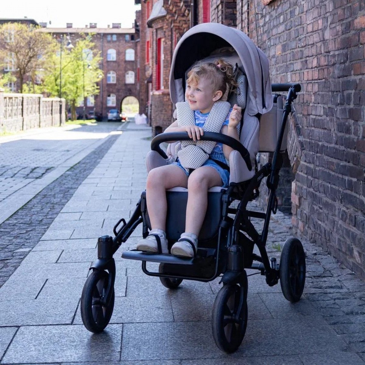 Коляска оснащена анатомическим сиденьем с мягкими вставками и регулируемыми подушками, которые обеспечивают устойчивость и поддержку корпуса. Уникальная функция «колыбель» позволяет синхронно менять угол наклона спинки и сиденья, переходя от активного положения к расслабленному. Надёжные ремни стабилизируют таз и препятствуют смещению во время движения.
