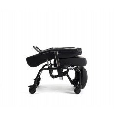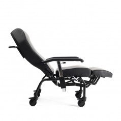 Кресло оснащено удобной спинкой с регулировкой наклона до 45°, управляемой как пользователем, так и сопровождающим лицом с помощью газовых пружин. Подножка синхронно меняет положение вместе со спинкой, обеспечивая поддержку ног под разными углами. Пластиковые подлокотники можно отрегулировать по высоте для дополнительного комфорта. Все элементы легко адаптируются под потребности пользователя без лишних усилий.