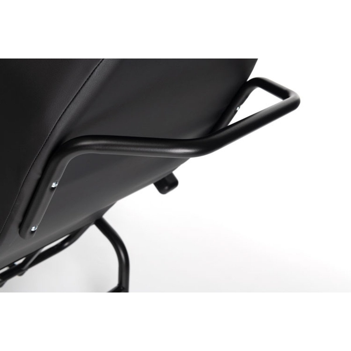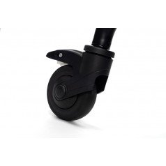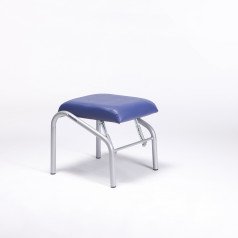 Кресло имеет прочную стационарную раму на четырёх ножках, при этом задние ножки оснащены небольшими колёсиками для удобства перемещения кресла в пустом состоянии. Сиденье выполнено из плотного материала с обивкой из кожзаменителя, который повторяет контуры тела, обеспечивая правильную поддержку и комфорт. Модель доступна в различных цветах и может быть укомплектована дополнительными аксессуарами.
