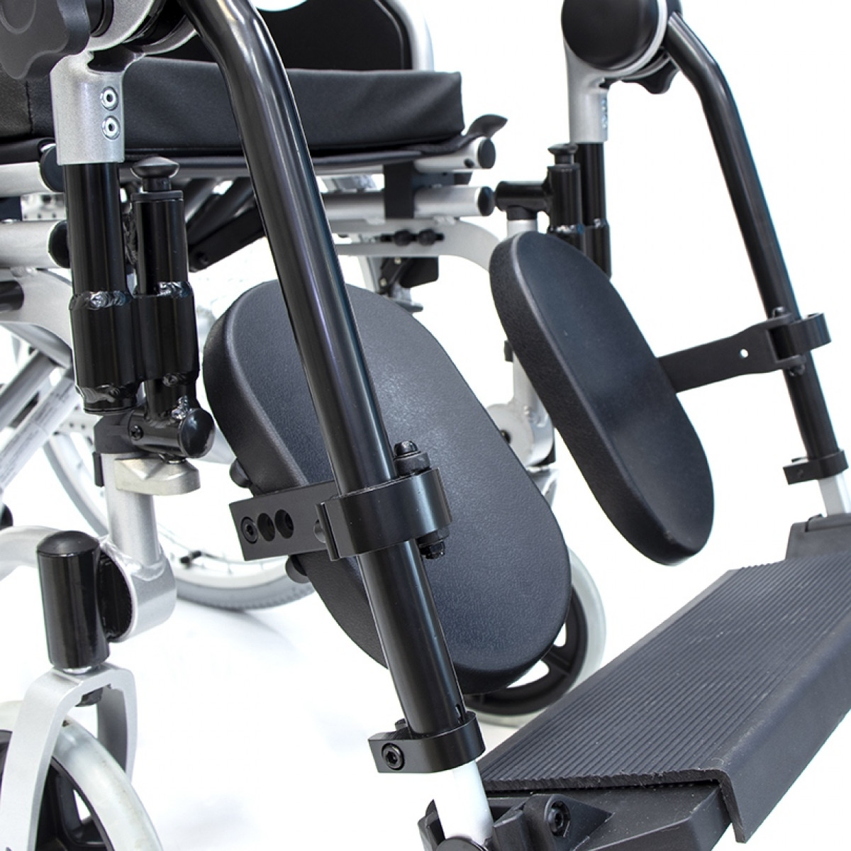 Подножки регулируются по высоте и углу наклона, оснащены ложементами и упорами для коленей для дополнительной фиксации. Опоры для стоп раздельные, при необходимости их можно объединить в единую платформу. Колёса доступны в вариантах: цельнолитые или пневматические, а для устойчивости предусмотрен антиопрокидыватель с регулировкой по высоте. Прочная алюминиевая рама с антикоррозийным покрытием обеспечивает надёжность и долгий срок службы.