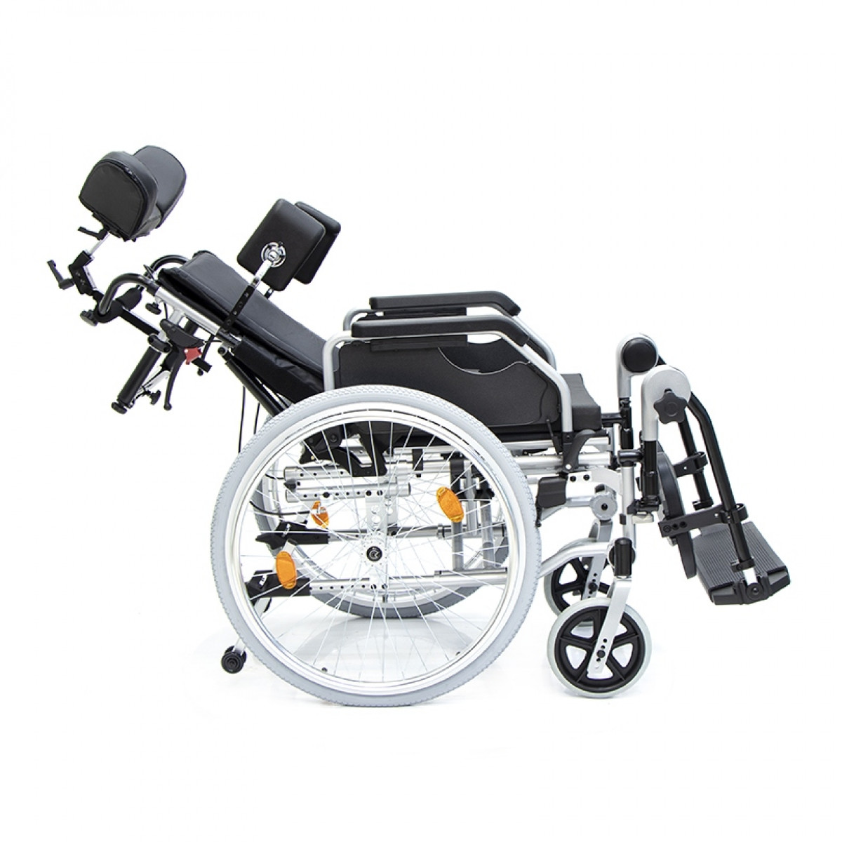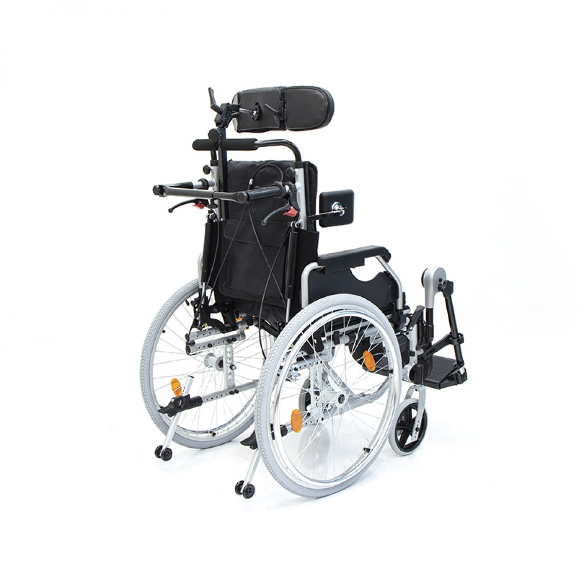 Коляска позволяет точно адаптировать положение пользователя: спинка регулируется по высоте и углу наклона и оснащена боковыми фиксаторами для поддержки корпуса. Сиденье настраивается по высоте, глубине и наклону, что помогает снизить нагрузку и подобрать удобную посадку. Подлокотники регулируются, при необходимости снимаются или откидываются, упрощая пересаживание.