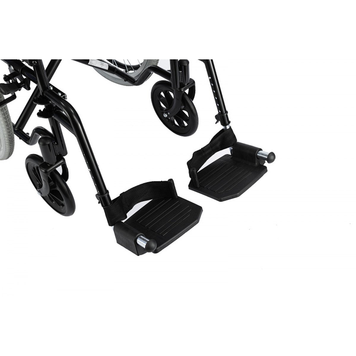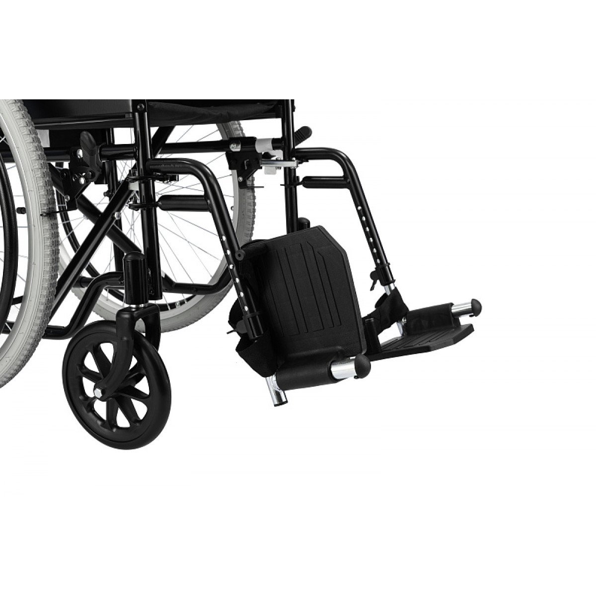Подножки съёмные, откидные и регулируются по длине голени, что помогает настроить удобное положение ног. Откидные опоры для стоп и продуманная конструкция делают посадку и использование коляски более комфортными.