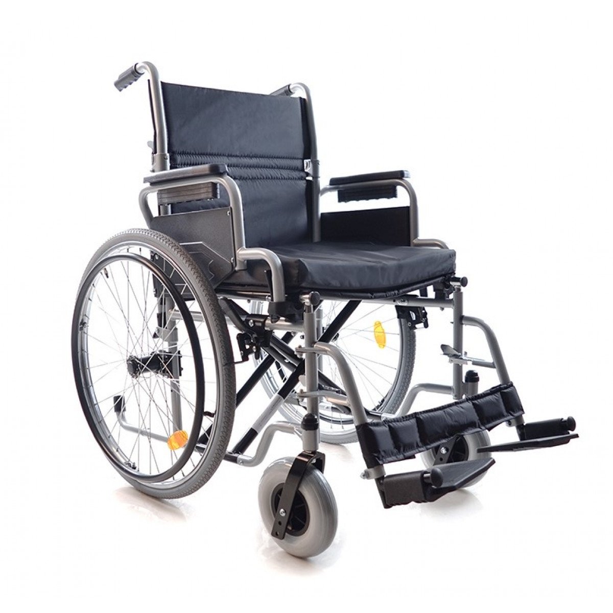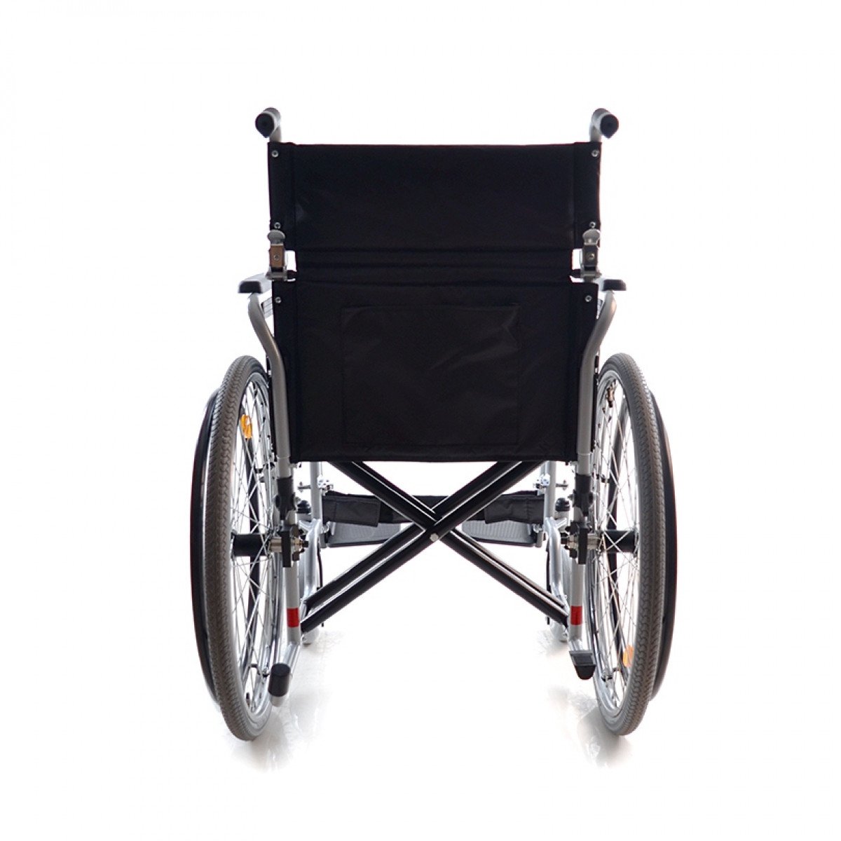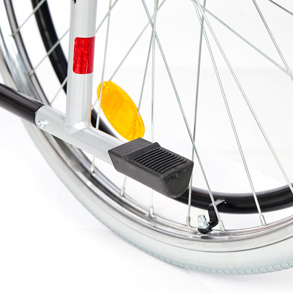 Рама выполнена из стальных труб с антикоррозийным покрытием — это про прочность и долговечность. Передние и задние колёса доступны в вариантах: цельнолитые или пневматические, что позволяет выбрать конфигурацию под условия использования. Задние колёса быстросъёмные и регулируются по высоте с помощью адаптера. Для безопасности предусмотрены стояночные тормоза и антиопрокидыватель с резиновым наконечником, который повышает устойчивость коляски.