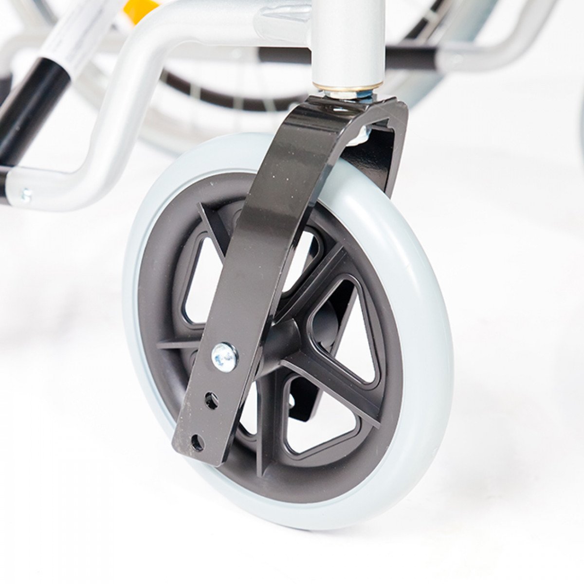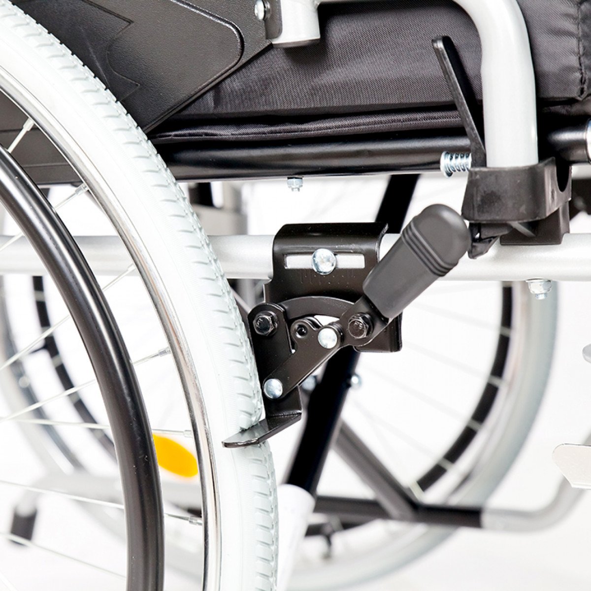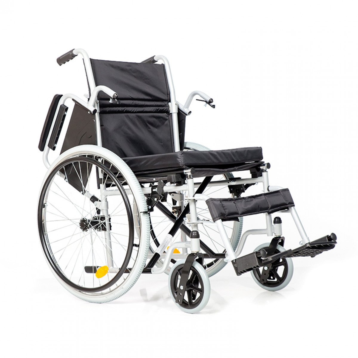 Рама выполнена из стальных труб с антикоррозийным покрытием — это про прочность и долговечность. Передние и задние колёса доступны в вариантах: цельнолитые или пневматические, что позволяет выбрать конфигурацию под условия использования. Задние колёса быстросъёмные и регулируются по высоте с помощью адаптера. Для безопасности предусмотрены стояночные тормоза и антиопрокидыватель с резиновым наконечником, который повышает устойчивость коляски.