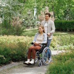 Съёмные и откидные подлокотники, а также откидные подножки облегчают пересаживание. Быстросъёмные задние колёса помогают компактно сложить коляску для перевозки.