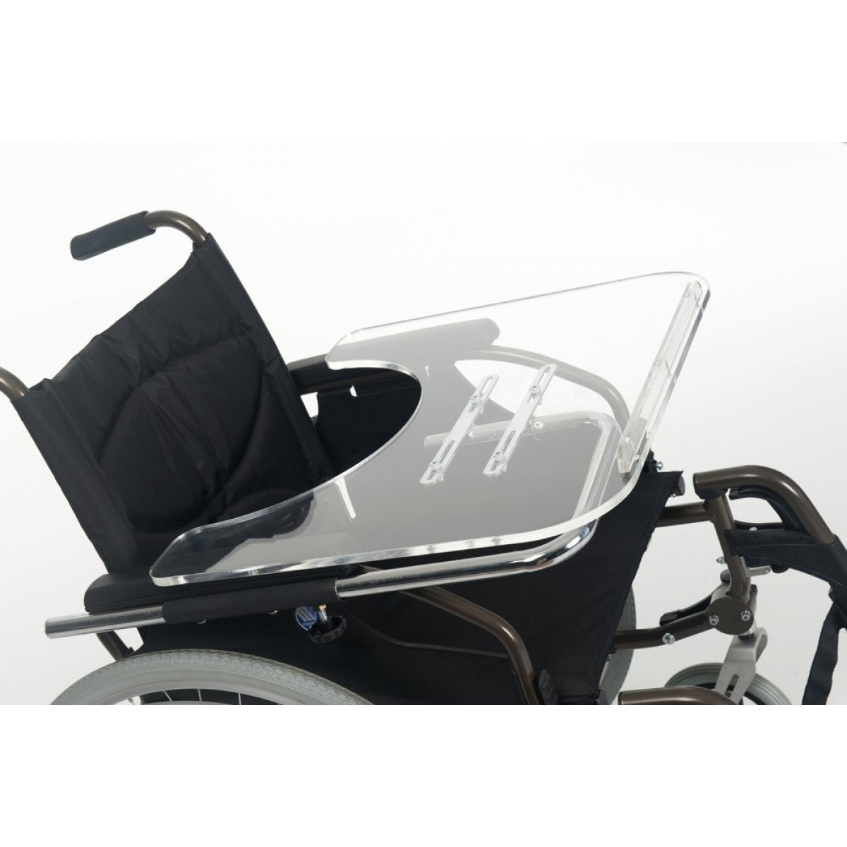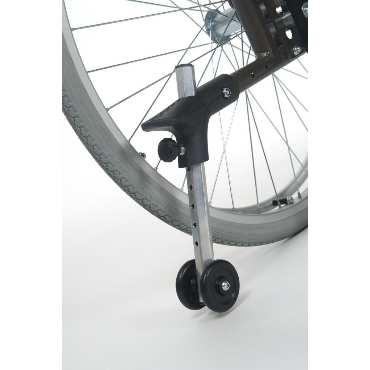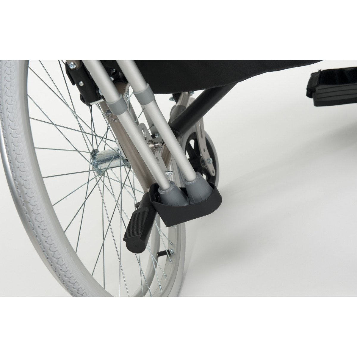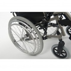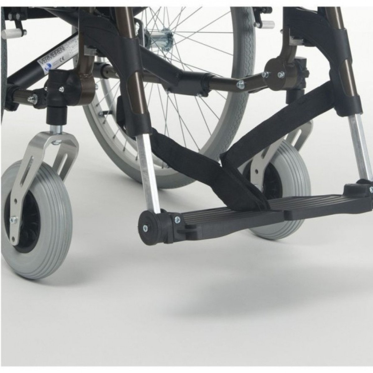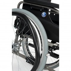 Vermeiren V200 может быть оснащена как литыми, так и пневматическими колёсами с возможностью быстрого демонтажа. Эти колёса, благодаря специальным адаптерам, легко регулируются по высоте, что обеспечивает еще большую гибкость в использовании. Для удобства пользователей также предусмотрены регулируемые по высоте подставки для ног, которые можно легко снять или отодвинуть в сторону.