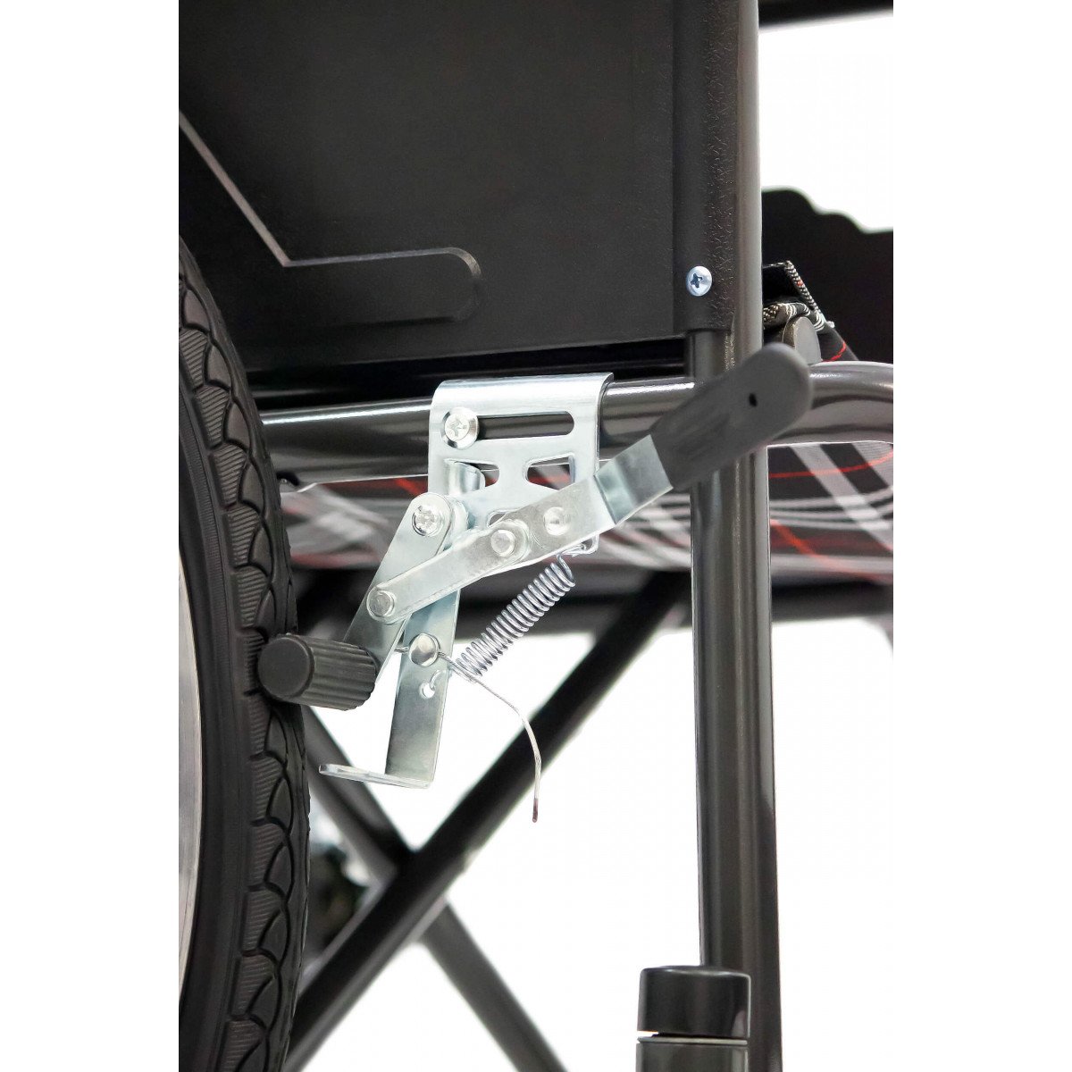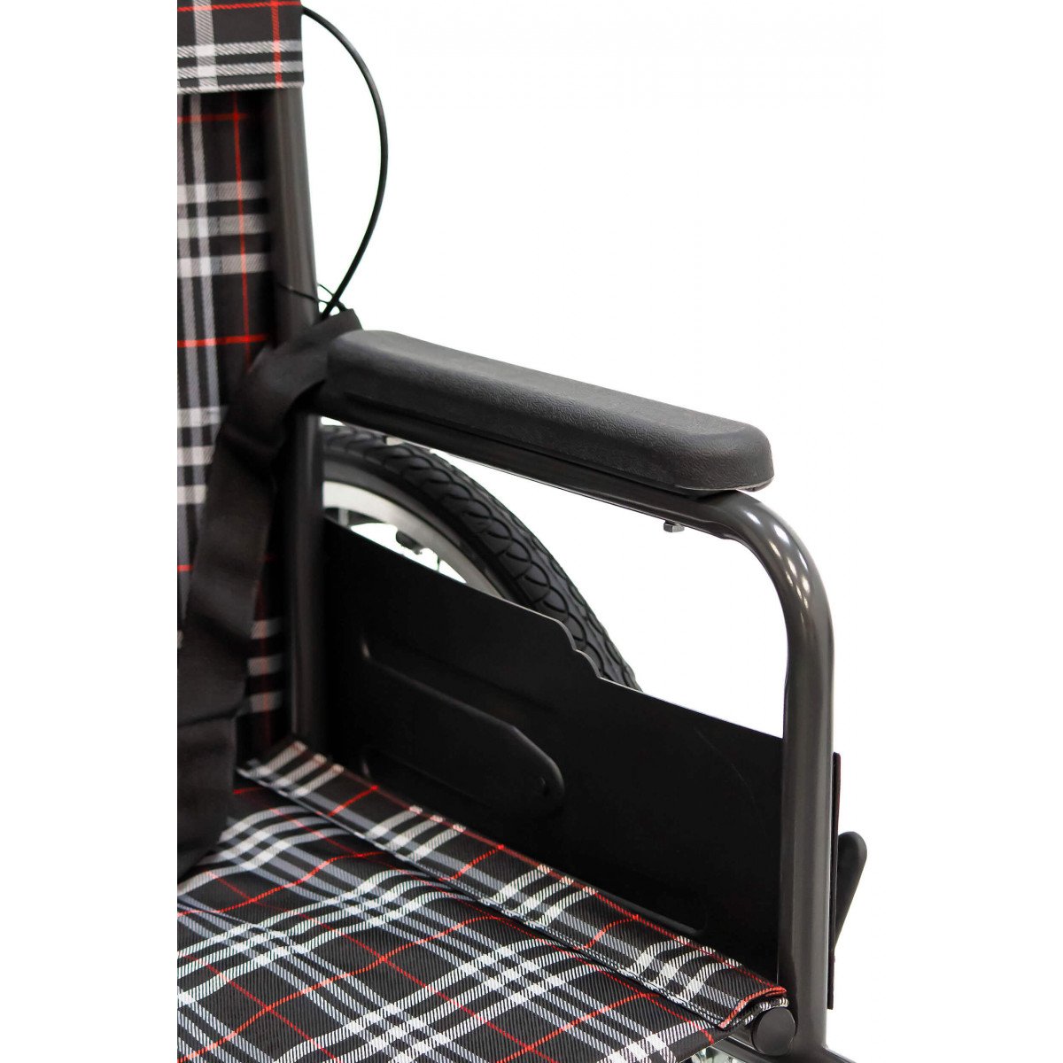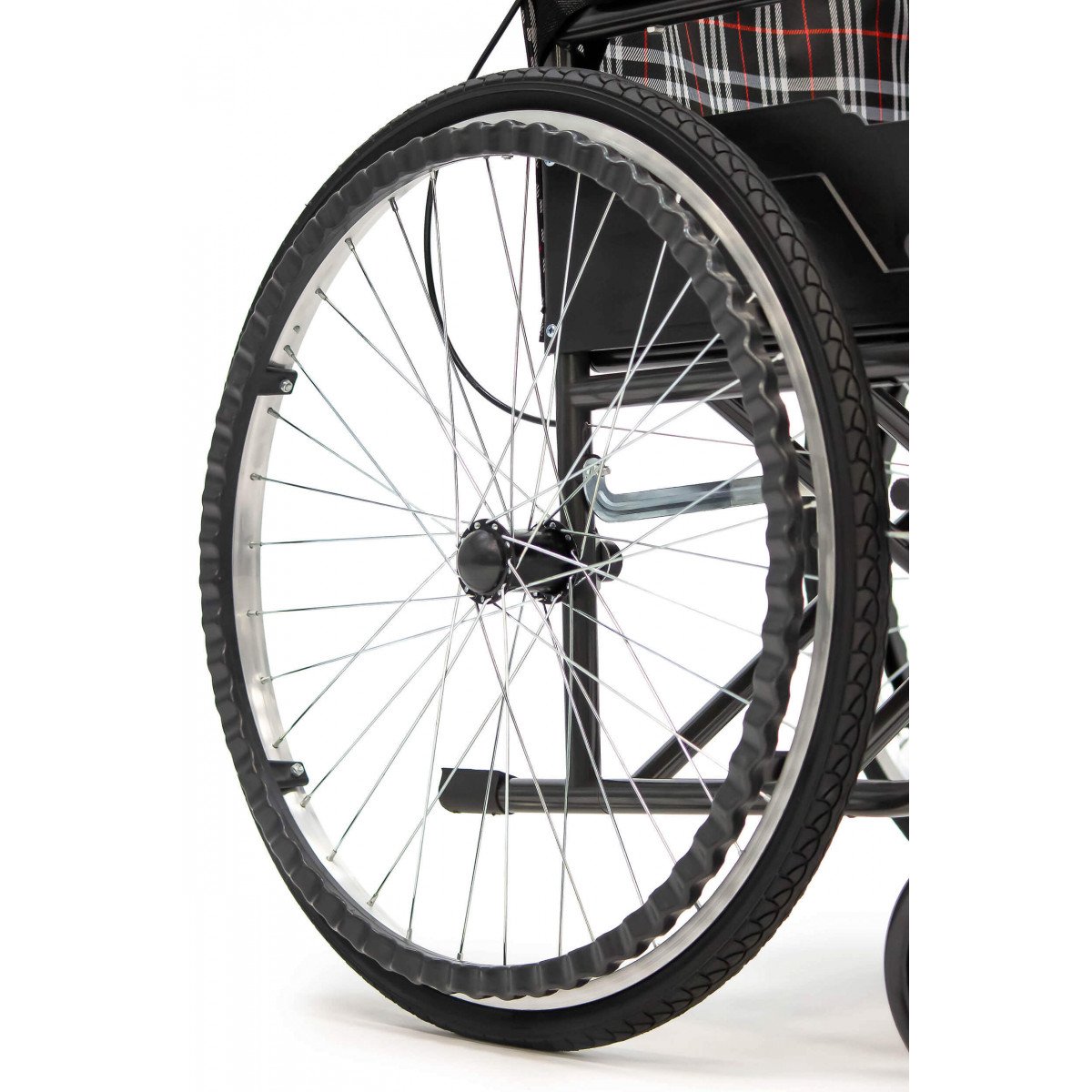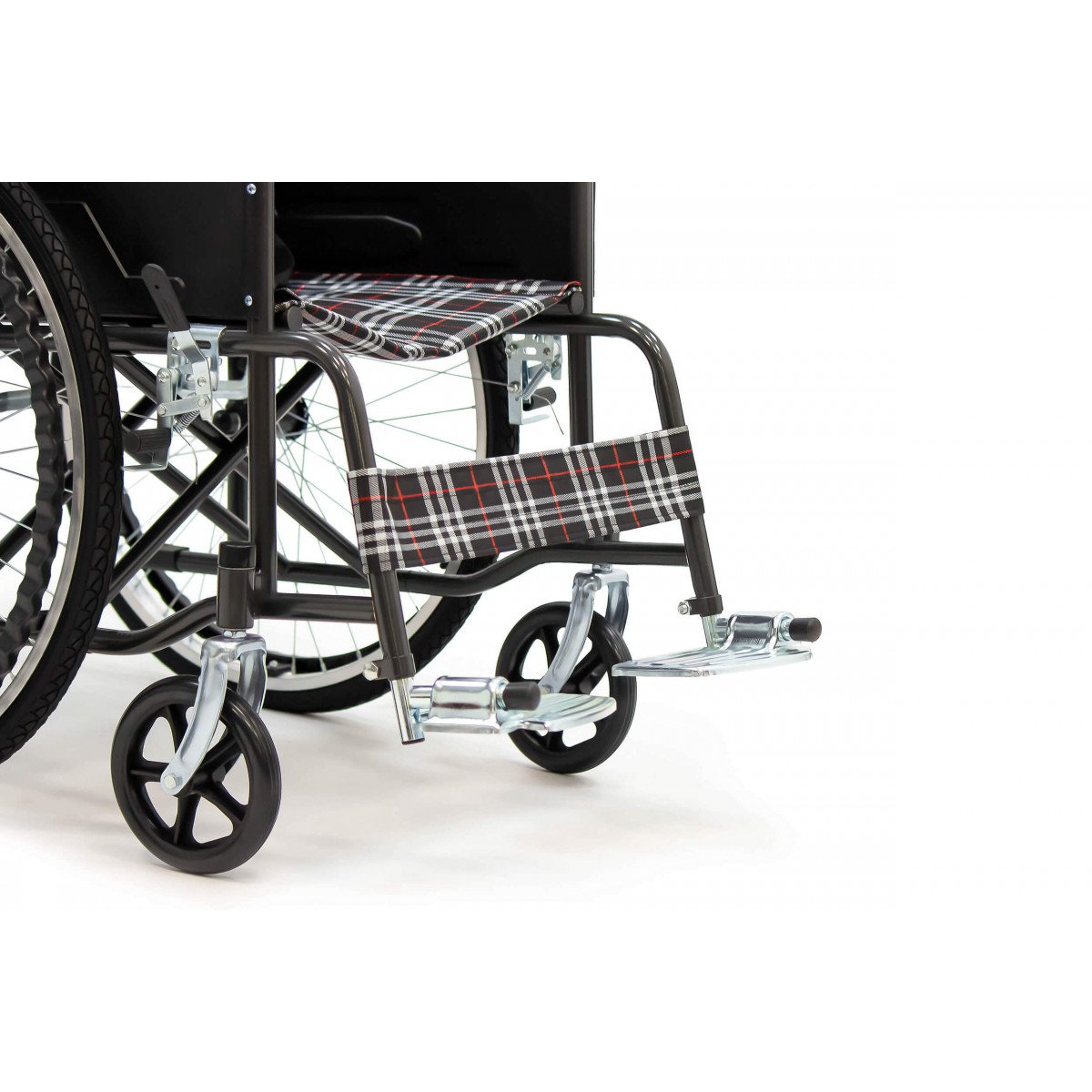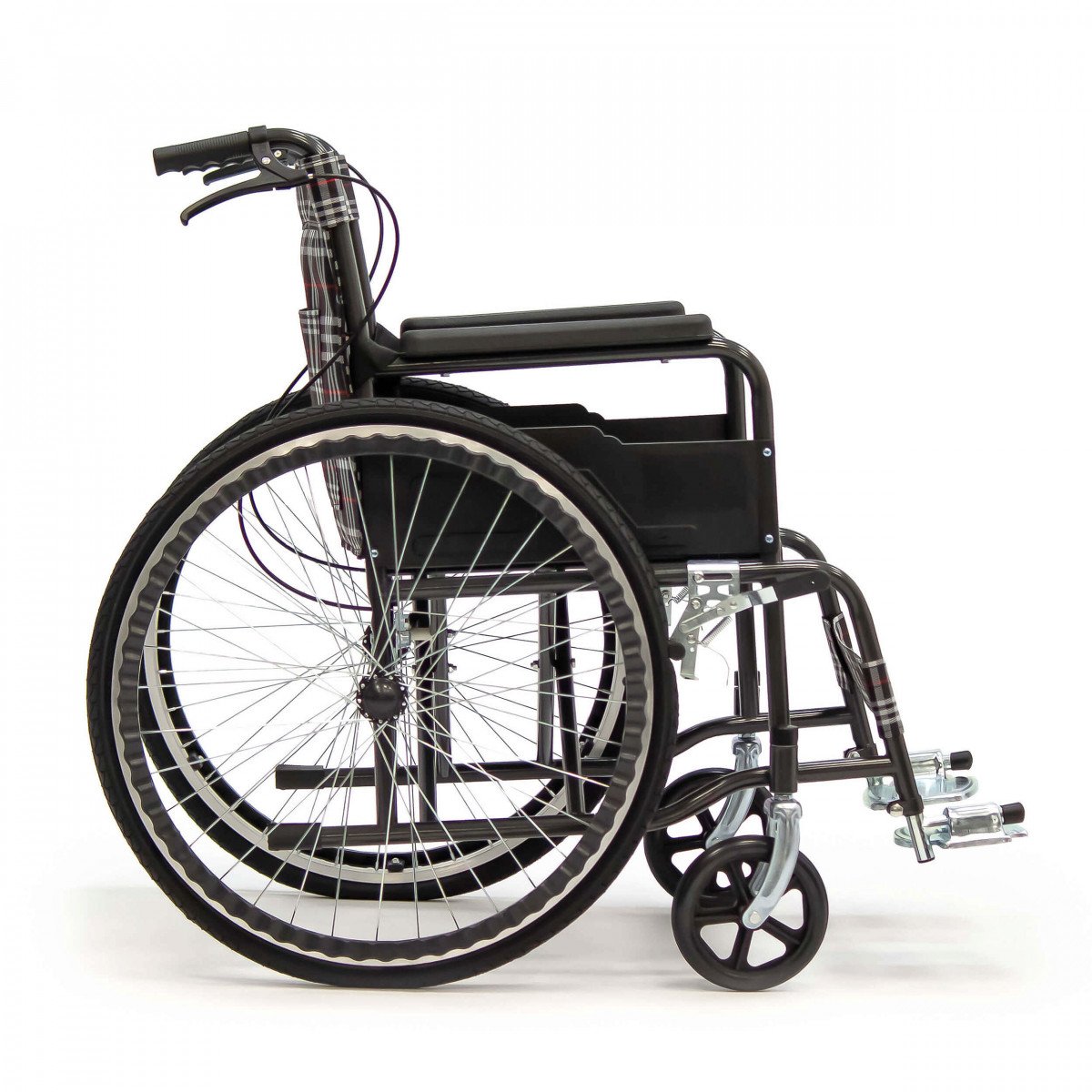 Конструкция простая и понятная в использовании. Сиденье выполнено из прочного полиэстера с водоотталкивающей пропиткой, подлокотники мягкие, а подножки регулируются по длине голени и дополняются поднимающимися опорами. Это позволяет настроить посадку и обеспечить комфортное положение пользователя. Рифлёные приводные обода упрощают управление, особенно если сила в руках снижена.