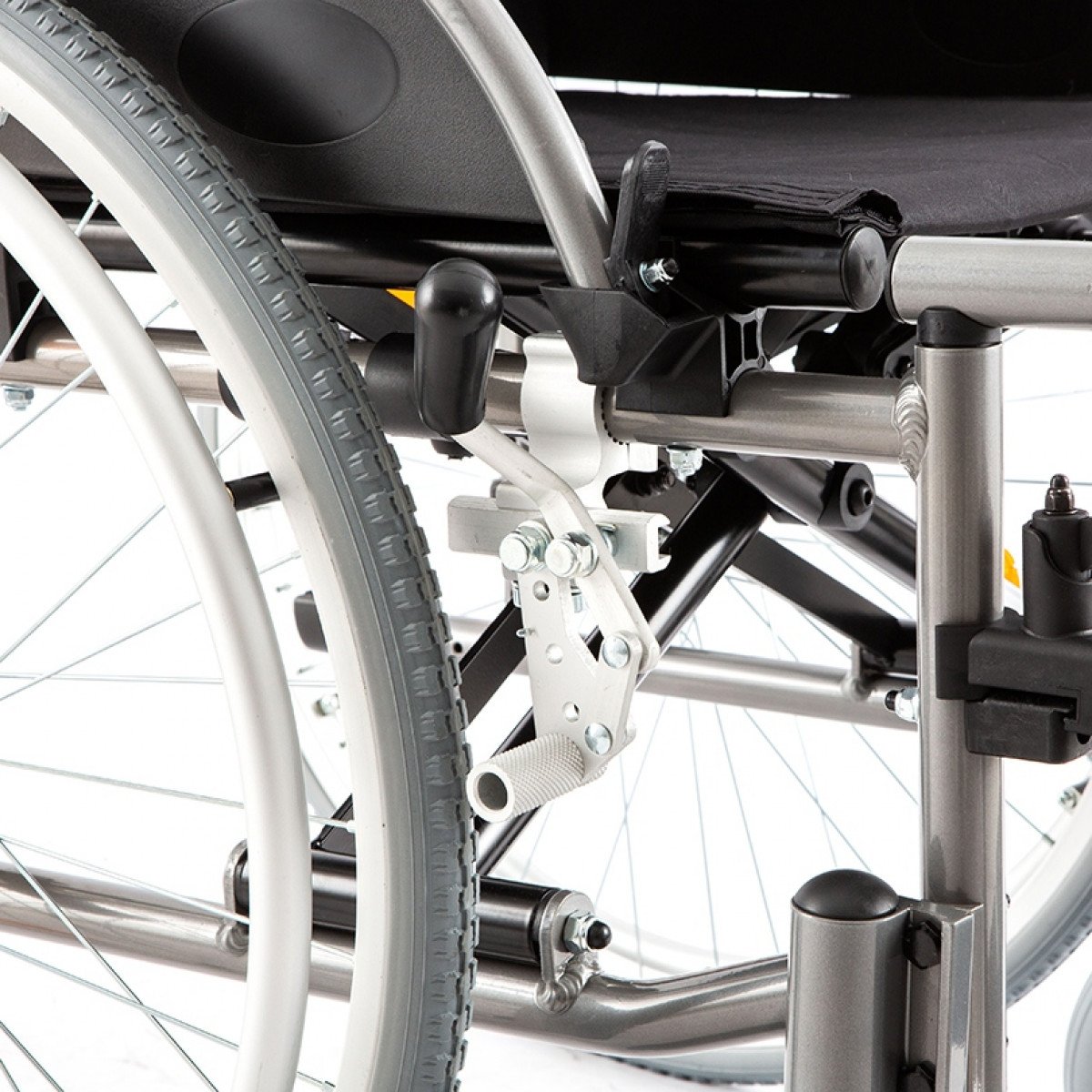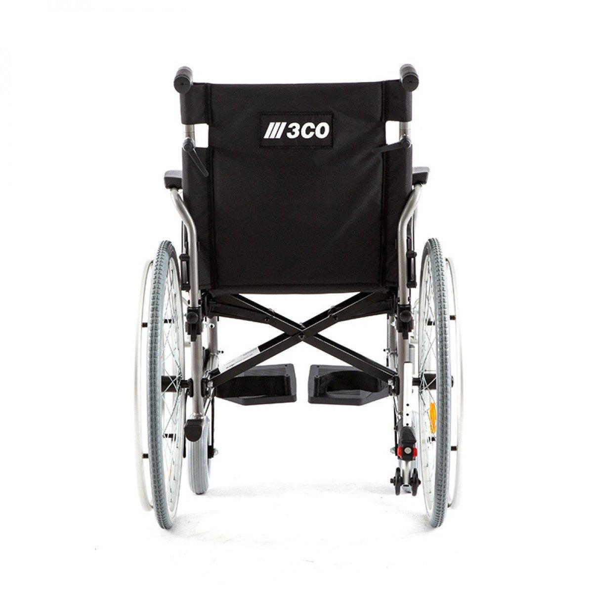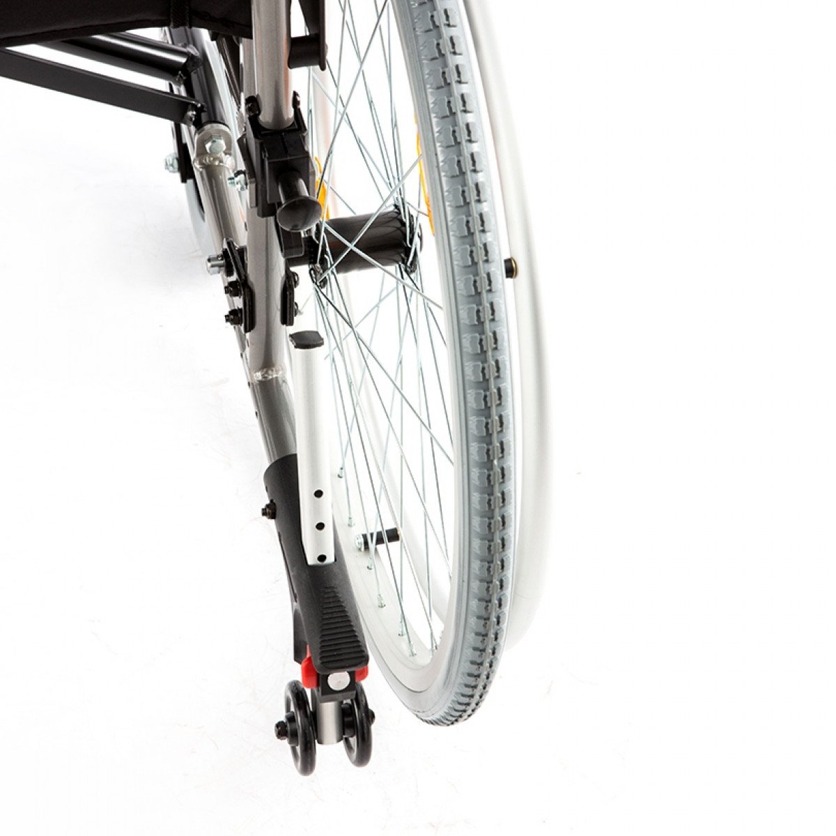 Рама выполнена из прочного металла и рассчитана на длительное использование. Задние колёса — быстросъёмные, с кнопочной фиксацией, а обода с антискользящим покрытием облегчают управление. С обеих сторон предусмотрены стояночные тормоза с возможностью регулировки, что повышает контроль и безопасность во время остановки.