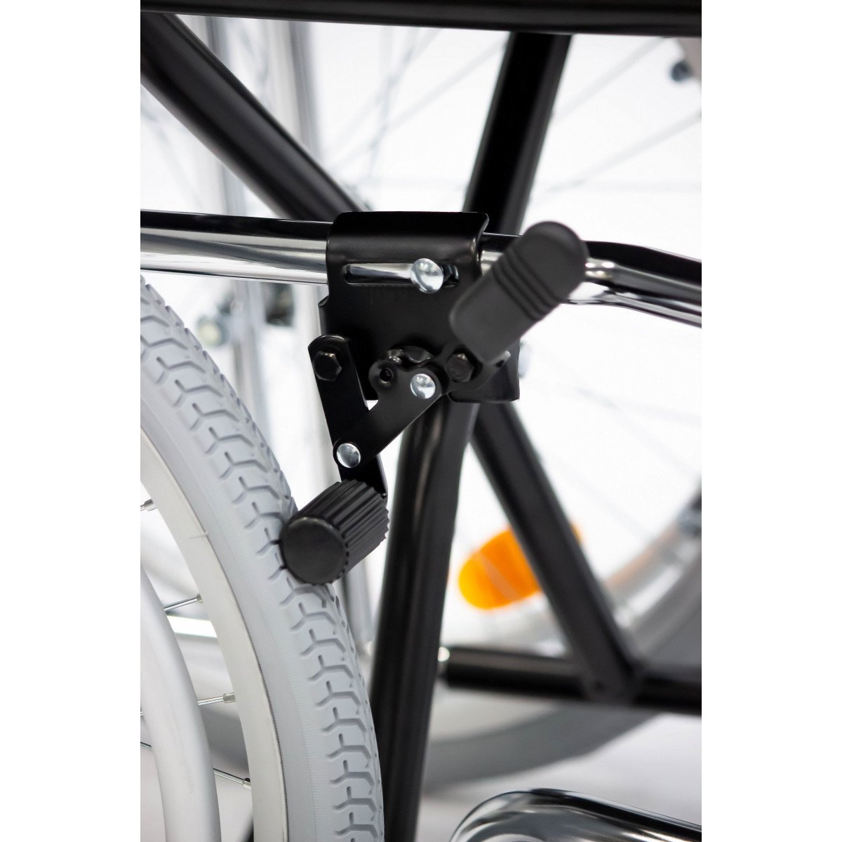 Пневматические колёса обеспечивают мягкий ход и помогают комфортно передвигаться по неровной поверхности. Для безопасной остановки предусмотрены боковые тормоза, которые надёжно фиксируют коляску на месте.