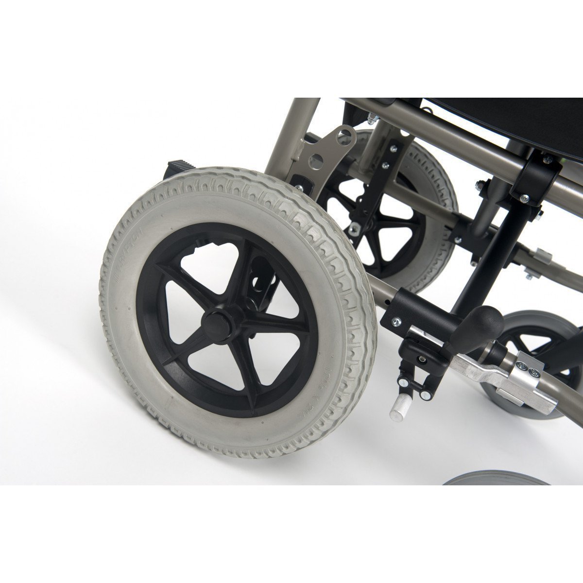 Прочная складная рама выполнена из алюминиевого сплава, что делает конструкцию надёжной и при этом лёгкой. Модель поддерживает установку как литых, так и пневматических быстросъёмных колёс, а специальный адаптер задних колёс позволяет регулировать высоту колесной базы и улучшать манёвренность в зависимости от условий и потребностей пользователя.
