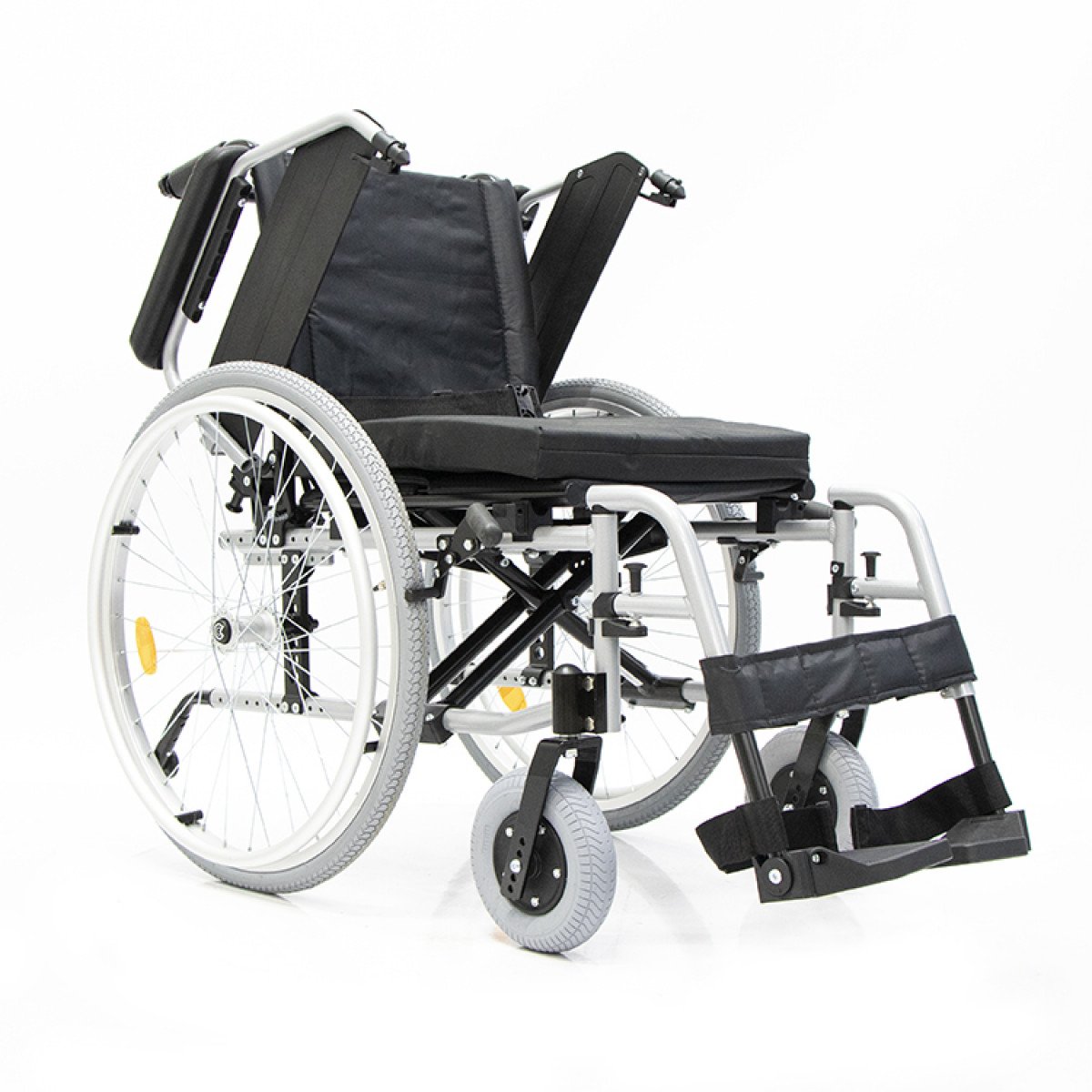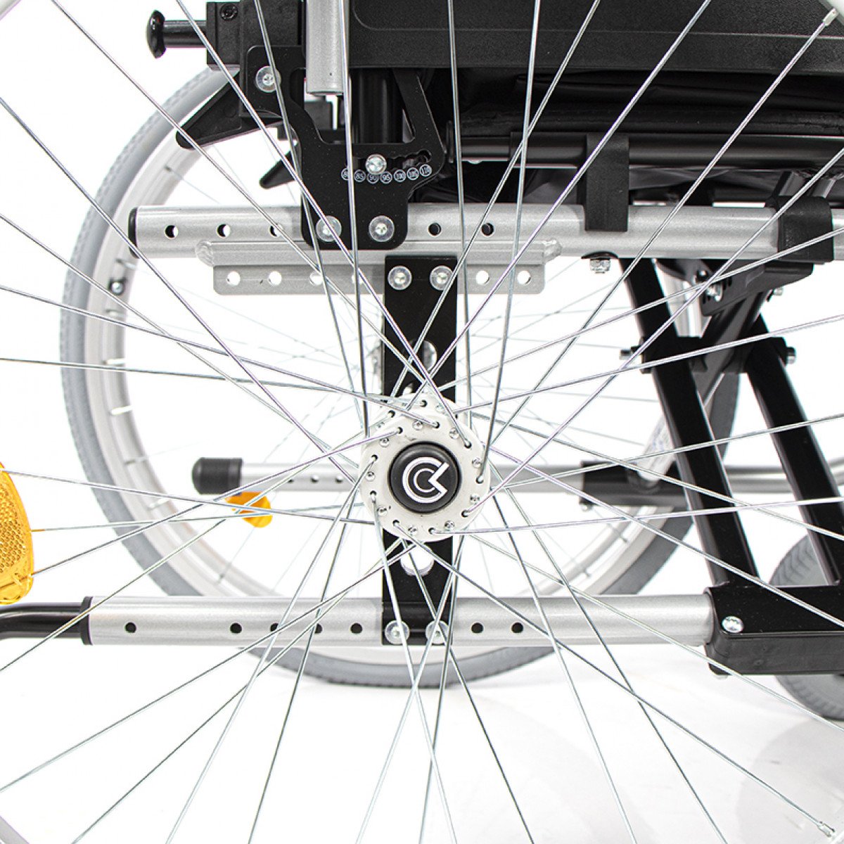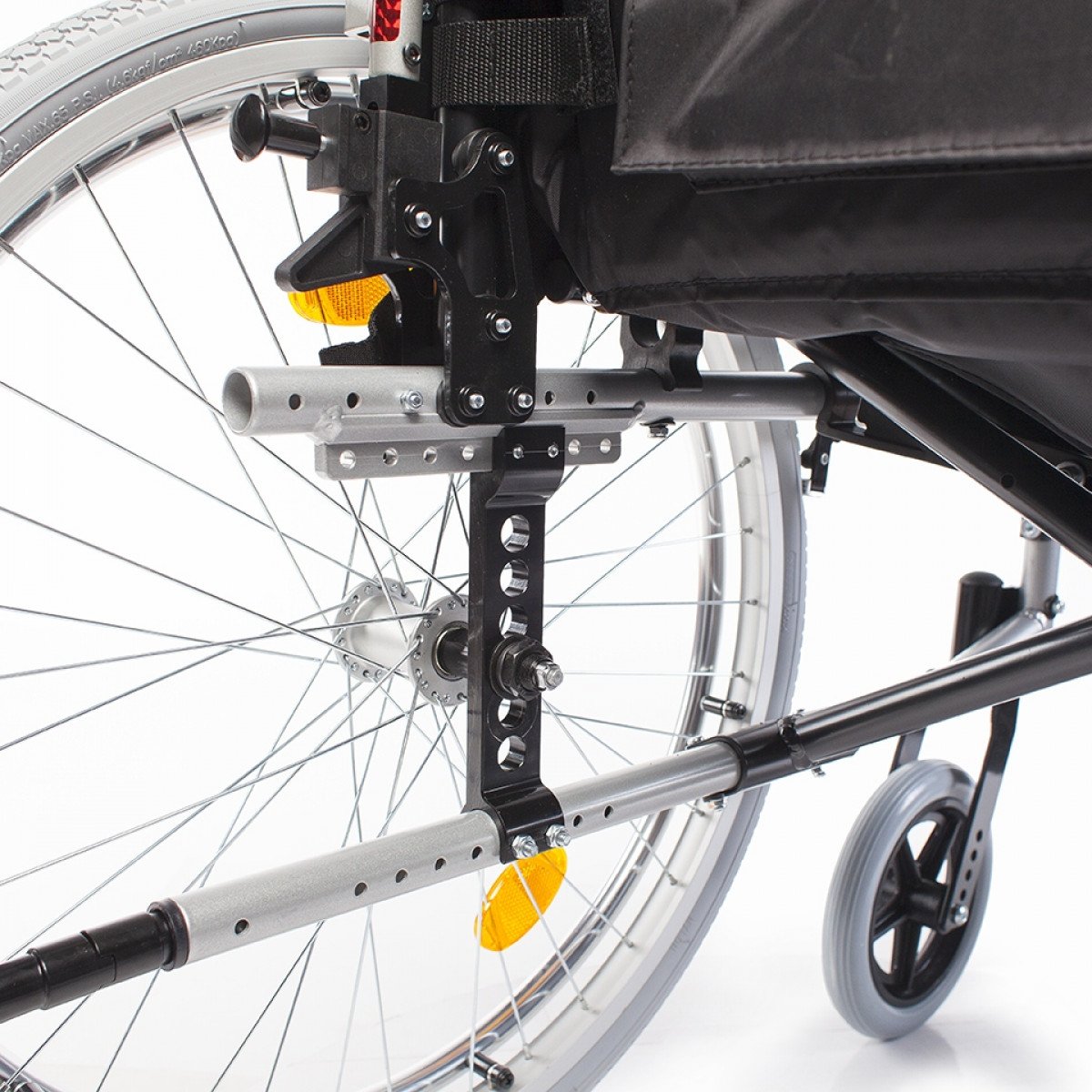 Передние и задние колёса доступны в вариантах: цельнолитые или пневматические — под разные условия эксплуатации. Задние колёса быстросъёмные, что упрощает транспортировку, а их положение можно регулировать. Для дополнительной устойчивости предусмотрен антиопрокидыватель на роликовой опоре с возможностью регулировки и снятия. Рама усилена распоркой жёсткости спинки, что помогает сохранить правильное положение пользователя во время движения.