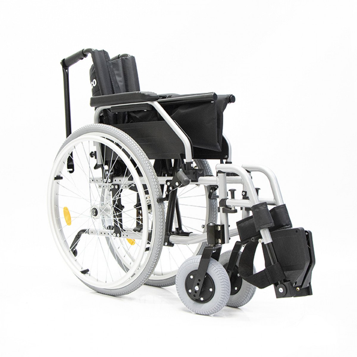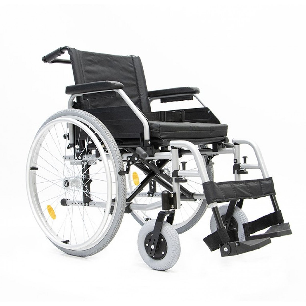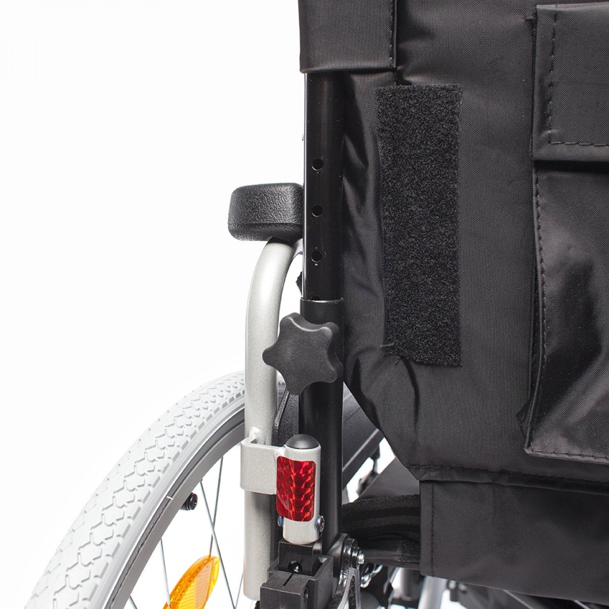 Передние и задние колёса доступны в вариантах: цельнолитые или пневматические — под разные условия эксплуатации. Задние колёса быстросъёмные, что упрощает транспортировку, а их положение можно регулировать. Для дополнительной устойчивости предусмотрен антиопрокидыватель на роликовой опоре с возможностью регулировки и снятия. Рама усилена распоркой жёсткости спинки, что помогает сохранить правильное положение пользователя во время движения.