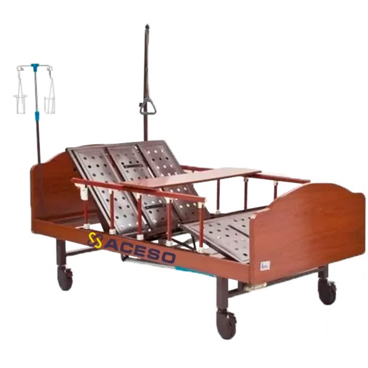 Кровать оснащена прочным стальным основанием с износостойким покрытием и устойчиво стоит на колёсах с надёжными тормозами. Трёхсекционное ложе с перфорированным металлическим основанием обеспечивает хорошую вентиляцию и комфорт при длительном использовании. Все регулировки выполняются механически — просто, понятно и без зависимости от электропитания.